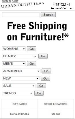 如圖三Urban Outfitters站點所示的那樣,在呈現數據結構和數據內容時,水平導航是一種廣泛采用的導航方式。用戶可以從左到右,點擊不同的站點鏈接來浏覽。Joshua Porter在一篇名為“The Challenge of Moving to Horizontal Navigation“的博客中,討論了在頁面頂端而不是頁面兩側使用水平導航的好處。至於頂端時,用戶可以更容易聚焦於頁面的內容,而在兩側時,會很容易干擾用戶視線。在我的研究中,90%的移動站點采用垂直導航的方式取代水平導航,包括如下圖所示的Urban Outfitters移動站點。