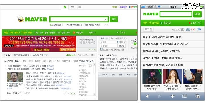www.naver.com的頁面效果與m.naver.com的頁面效果