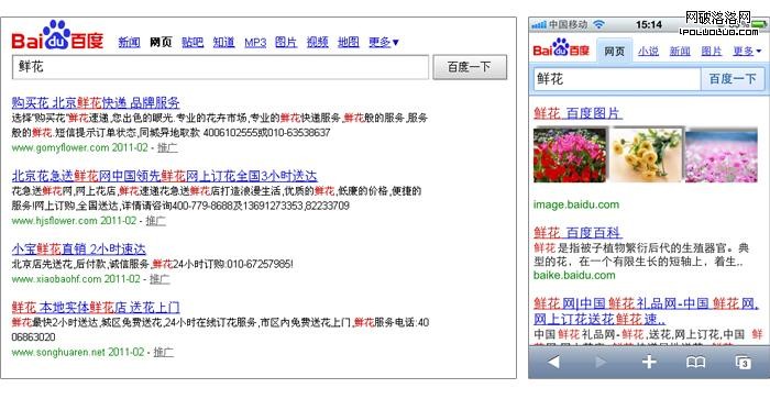 www.baidu.com的頁面效果與m.baidu.com的頁面效果