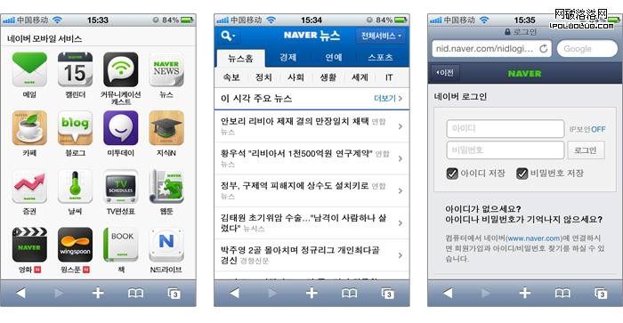 在naver的Mobile Web視覺設計中使用了大量移動終端本身的視覺特點,如產品的鏈接采用app icon的方式,各級頁面中導航的設計等等。