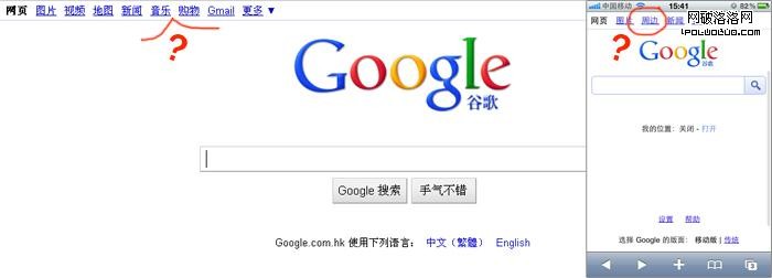 www.google.com.hk的首頁與m.google.com.hk首頁