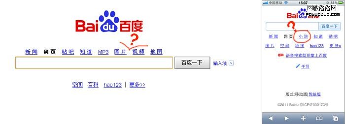 用戶在使用個人電腦上網與使用移動設備上網時的需求,因為使用場景,使用時間 ,使用群體等等的不同,以及移動設備本身的反推可能有著越來越大的差異。所以我們看到在個人電腦端的baidu首頁沒有“小說”鏈接,但在移動終端的baidu首頁上擁有獨立的“小說”頻道。