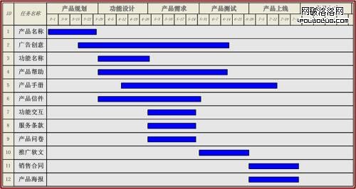 答:再龐大和復雜的體系都需要分拆來實現。首先是分階段實現:撇開產品的市場和用戶調查階段,產品規劃、產品功能設計、產品需求、產品測試、產品上線、產品入市、產品售後這幾個階段都可以作為文案體系的時間節點。下面是一張甘特圖,橫軸是產品進度的幾個階段,縱軸是文案體系的12個內容。
