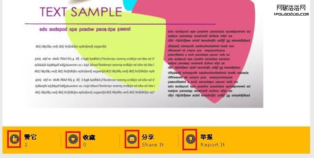 如圖二:底圖4個小圖標按鈕,搭配文字,每一個圖標圖片形象表達了贊它,收藏,分享,舉報的意義,規律而生動,這個就是文字和圖片的統一,也就是形式和內容的統一。