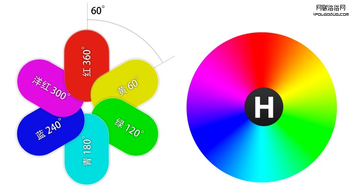 HSL的H(hue)分量,代表的是人眼所能感知的顏色范圍,這些顏色分布在一個平面的色相環上,取值范圍是0°到360°的圓心角,每個角度可以代表一種顏色。色相值的意義在於,我們可以在不改變光感的情況下,通過旋轉色相環來改變顏色。在實際應用中,我們需要記住色相環上的六大主色,用作基本參照:360°/0°紅、60°黃、120°綠、180°青、240°藍、300°洋紅,它們在色相環上按照60°圓心角的間隔排列,如下圖: