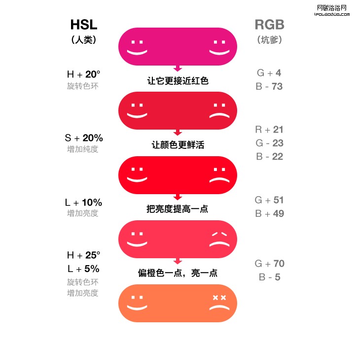 雖然得到了需要的色彩,但我們所做的事情與“橙色”或“增加亮度”實在扯不上關系。這種調色方法,完全不符合我們對顏色的直觀感受。連這種事都可以忍受嗎?不要再假裝視覺設計師了,舞台燈光師才是你的真實身份!