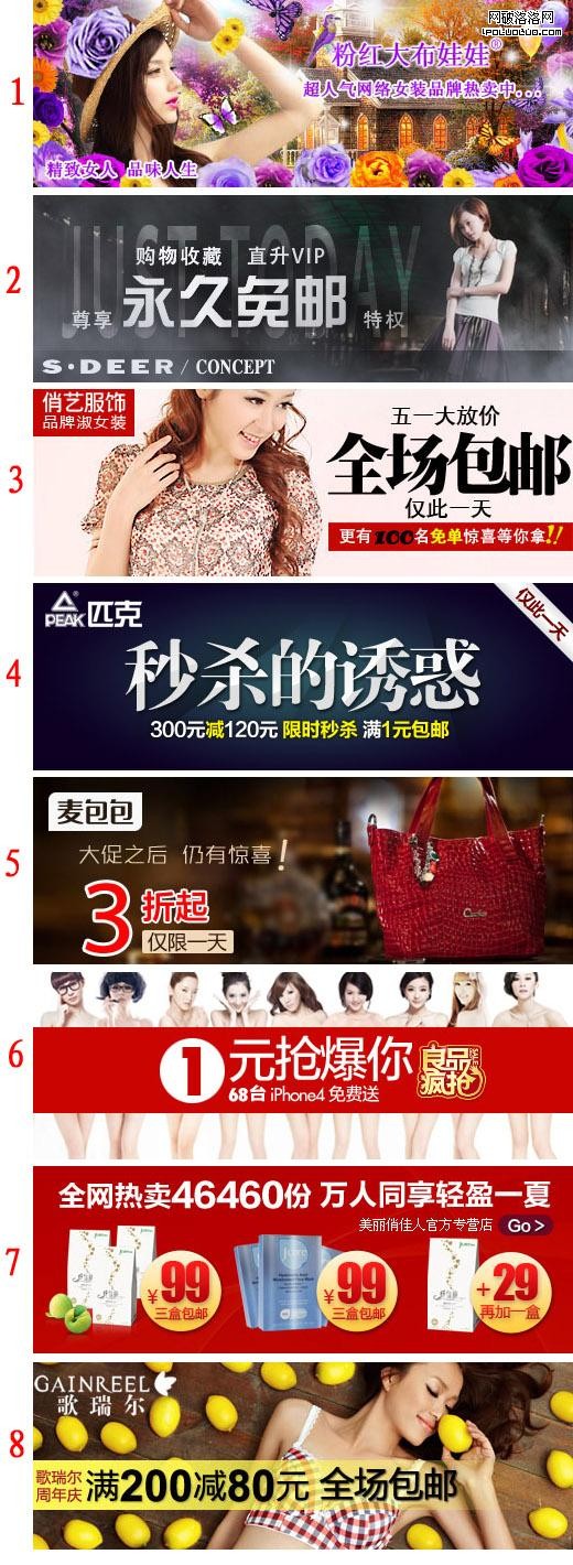 圖一:色彩炫麗濃重,偏可愛方向,突出品牌,店主的概念,無促銷字眼,無數字