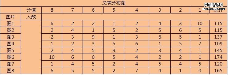 我整理了一下數據,將第一點擊的權數設為8,第二點擊的權數設為7,以此類推,最後點擊的權數設為1。於是整理出來了八張圖各自的得分權重如下: