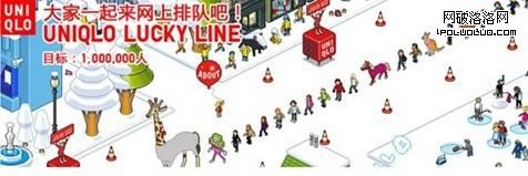 今年12月,一場瘋狂的虛擬排隊活動在中國內地悄然開展,並迅速引發網絡熱潮。這是著名日本休閒服裝品牌優衣庫與人人網合作推出的“UNIQLO LUCKY LINE”網上排隊活動。參與者用自己的人人網賬號登錄活動頁面,選擇一個卡通形象,就可以用這個小人和其他人一起,在優衣庫的虛擬店面前排起一串長長的隊伍。網友在優衣庫網站虛擬UNIQLO店鋪排隊購物,即有機會獲得iPhone4、iPad、旅游券、特別版紀念T恤、9折優惠卷等禮物。短短一周時間,這次網上排隊活動已經有超過93萬人次參與。參與者在排隊的同時,還會在其人人網主頁上生成一條“新鮮事”消息,分享給其好友,排隊的人多了,就出現了刷屏。從12月3日登陸人人網,不到兩周時間,優衣庫的粉絲人數已經接近11萬人。
