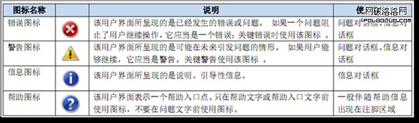 標准圖標有如下四種,錯誤圖標、警告圖標、信息圖標和幫助圖標,其說明和使用場景見圖9。只有關鍵錯誤和警告才能使用錯誤圖標和警告圖標,用戶需要一目了然地辨別信息的性質以及他們響應的後果,因此我們必須區分關鍵和非關鍵錯誤和警告。