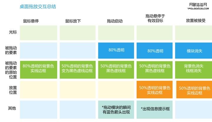 從以上桌面和WEB拖放交互來看,WEB的拖放的交互並沒有桌面環境中的拖放交互豐富,這跟浏覽器環境本身的限制有關。但在WEB環境中,光標的變化卻有很強的拖動暗示,這也是幫助人們實現拖動最重要的開始。從以上鼠標操作和拖動要素的比較圖中,設計師也可以從中找到更多拖放交互設計的參考。