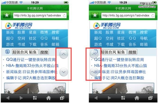 在QQ浏覽器中用戶可單手翻頁,定制左、右手操作習慣,尤其在電阻屏設備上提供這種設計尤為易用,因為用戶的雙手並不靈巧。