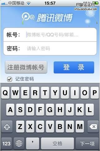 iPhone版騰訊微博登陸界面,默認提供虛擬鍵盤。直接呈現輸入配置,減少了鍵盤呼出操作。