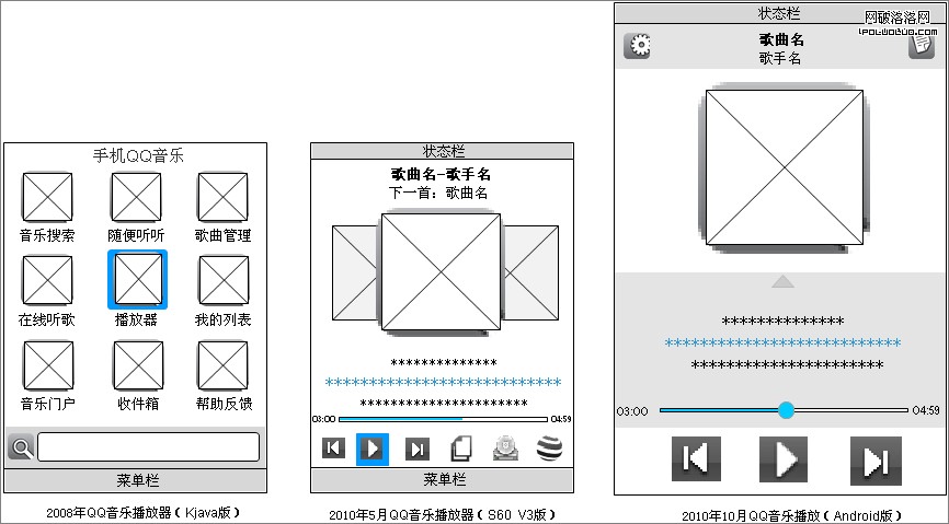 2010 QQ音樂播放器棄用了九宮格形式,改變九個功能點並行處理的方法,突出目標用戶聽音樂、看歌詞等重點需求,直接采用Tab頁簽左右切換的導航,讓用戶直觀查看操作。Android版的QQ音樂播放器,更是直接突出快速聽音樂的需求,利用觸屏特性,在默認播放器界面上相對弱化了設置、選擇等功能,把它們放在第二操作層面,以“簡”勝“繁”。