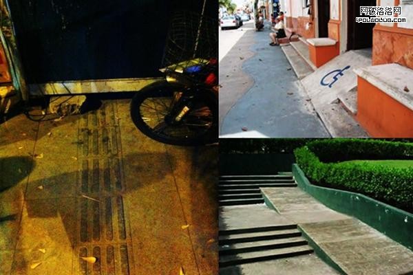 現實當中可能會遇到這樣的情況:這是盲道遇到一堵牆的照片(見左圖)。這是兩個無障礙坡道的照片(見右圖)。我很期望做出這個坡道的人,自己坐在輪椅上嘗試一下這樣的坡度。可以看到,我們有時候看似在給殘障人士一些便利,但實際上並沒有幫助到他們。