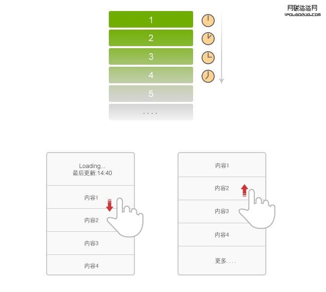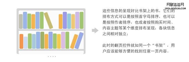 以上就是對手機端產品翻頁控件做的一些粗淺整理歸納。具體到設計應用中,我們需要根據產品性質、用戶操作使用情景、手機和操作平台本身的特性等具體情況來考慮設計使用翻頁控件。