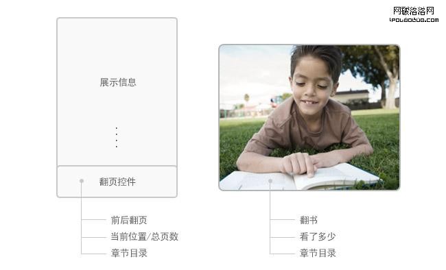所展示的信息具有很強“連續性”“流”等屬性,典型的例子是網絡小說、電子書等長篇幅的閱讀類信息。對比傳統的閱讀行為,這類產品的翻頁操作要盡可能的符合用戶的心理模型:一本書拿在手裡,書有多厚,看了多少,書的章節目錄,上一次讀到哪裡(通過書簽或折頁等記號)……都是一目了然的;此時的翻頁控件,也不僅僅要提供簡單的前後翻頁功能,同時也告訴用戶當前的閱讀位置(如“23/344頁”等),提供快速翻頁和定位的功能(如頁面跳轉功能和縮略浏覽等),同時能夠標記最後一次閱讀的位置。