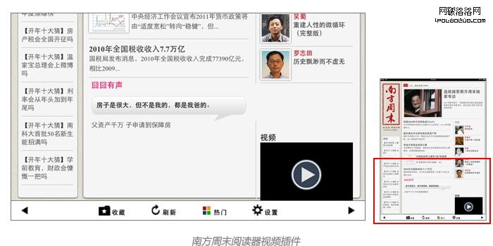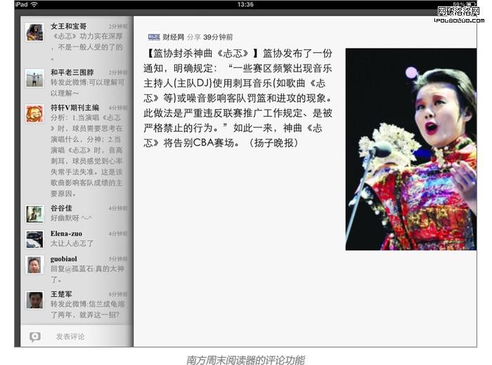 南方周末ipad閱讀器加入了網友評論,並可以實時更新,類似於網頁新聞評論。這種互動式的交流會帶給閱讀者更多的信息。
