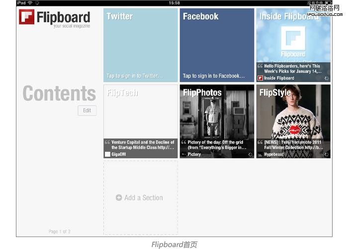 Flipboard的信息來自facebook以及twitter等當下最為流行的信息來源地。這類資源可謂無限充足,每天的更新量巨大,對於用戶來說非常充足。