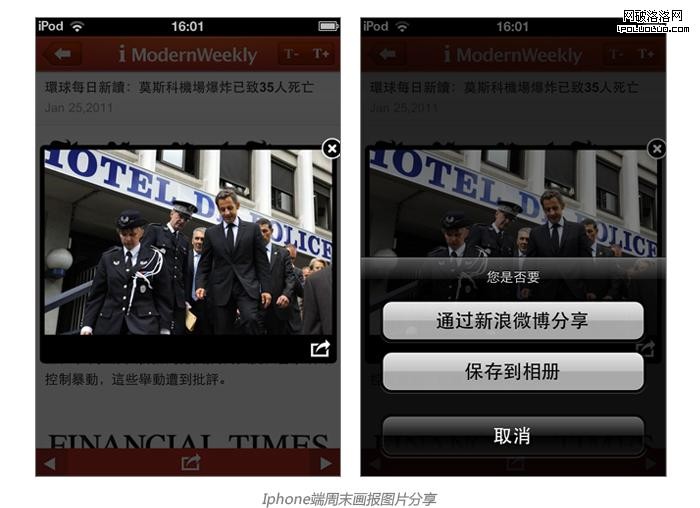 周末畫報的分享功能比較有代表性,可以直接分享至固定微博,也可以保存圖片至相冊。