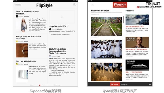 這其中周末畫報以縮略圖的形式顯示,而flipboard則以標題形式顯示。這一定程度上也是兩個產品屬性不同造成的。周末畫報以內容為主,每期的內容量固定。而flipboard以抓取內容為主,內容量不固定,極易超過相當大的數量,如果都以縮略圖顯示,則容易造成載入過慢,反應速度減緩,從而削弱體驗。