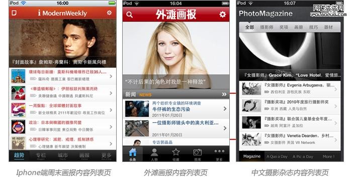 Iphone端由於屏幕面積較小,排版一般以豎屏寬度為列表形式,配以小圖,豐富畫面。並且可以在頂端大圖顯示推薦內容。周末畫報還提供大圖橫向拖動,提供了更多的推薦位內容。