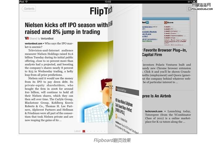 隨著蘋果iPad的推出,電子雜志類行的應用大受好評,電子閱讀需求量不斷增長。傳統紙質出版物的良好的視覺效果,互聯網巨大的信息資源庫,將這兩者集合在一起就會誕生非常好的雜志客戶端應用。這種雜志型客戶端應用的最佳代表就是Flipboard。