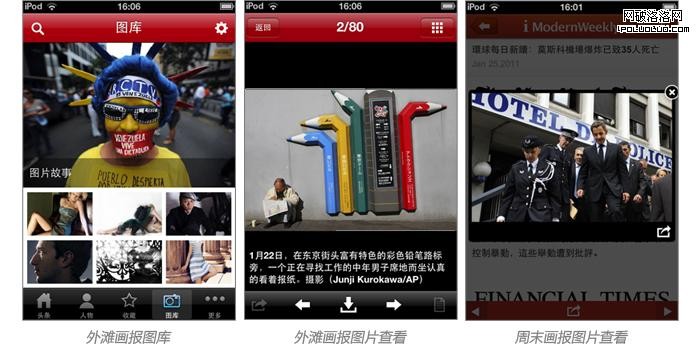 還擁有傳統編輯的周末畫報也利用網絡進行內容更新。每周更新的時間,ios主界面上會有更新的文章數量提示,和app store更新的提示方式一致。