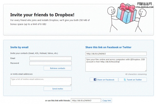 你可以自己到https://www.getdropbox.com注冊,只獲得2G免費空間;或者使用http://db.tt/u2h6NkO這個鏈接注冊,獲得額外的250M空間。(這是我的推介鏈接,但是我已經沒有機會獲得返利了,目前我的空間已經達到最大。)
