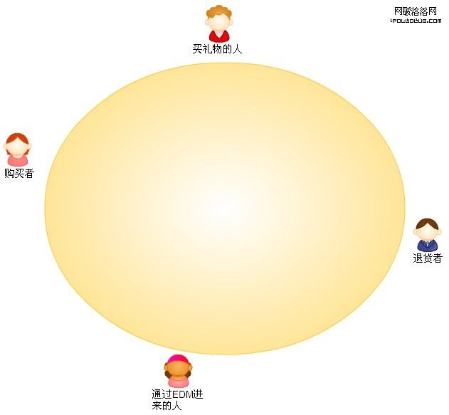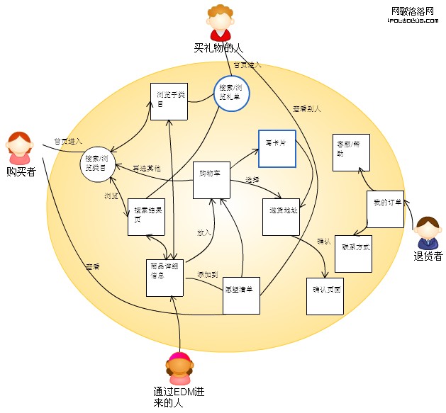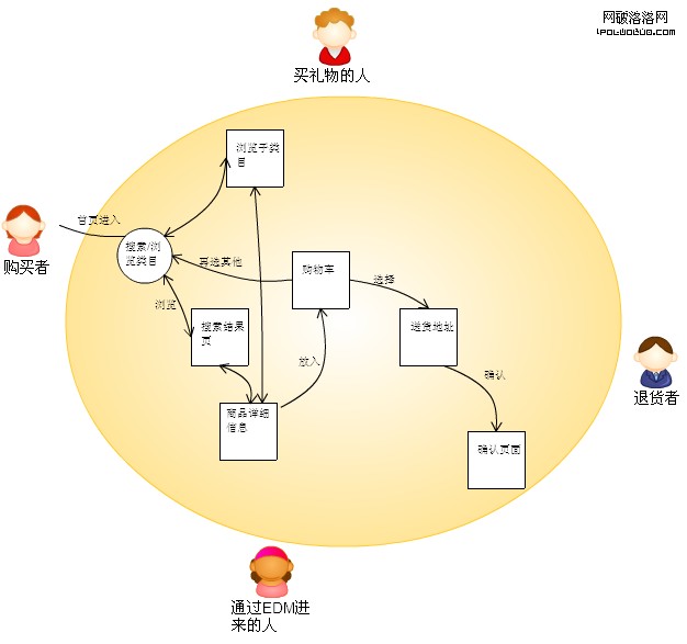 有了人物角色,除了身份我們要分析他們來網站的不同目的,他們采用什麼方式來到網站。比如某B2C電子商務網站,使用者主要包括購買者、買禮物的人、通過EDM(email營銷)進來的人和退貨者。如圖所示:
