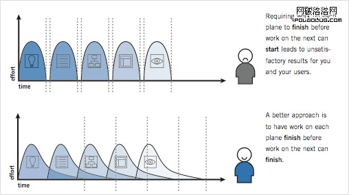 經過上面的傳遞後產品需要滿足的核心需求得到認同,產品的框架與產品邏輯都得到確認,在接下來的傳遞過程中,主要涉及到視覺設計師、開發工程師,問題已經不大,面臨的一個核心問題就是排期。這裡可以直接采用《用戶體驗的要素》中提到的方式“不能完整結束了這個階段的工作,才開始下個階段;在下個階段該結束的時候,完成這個階段這個階段的工作”