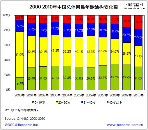艾瑞咨詢調查顯示 中國的網民年齡結構趨於均衡,中高年齡層用戶增長迅速。截至2010年6月,20~30歲的網民由2000年的61.0%逐漸縮減為28.1%,占比最小的31~40及40歲以上的用戶已分別增至22.8%、18.2%,網民年齡結構不斷成熟。網民年齡結構趨衡的原因首先在於隨著社會經濟的發展,互聯網已由早期的新鮮事物普及成為人們日常生活中經常接觸的應用,與人們生活的整合度不斷提高。此外,10年的時間跨度使得網民發生代際更替,原屬於低齡階段的一部分用戶已成長為中高齡網民。所以對於網站的老年用戶可用性的探索非常有必要 。