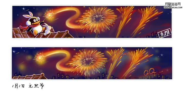 元旦節過程稿是這樣構思的:QQ手拿“仙女棒”在夜空中劃過,隨即燃起2011字樣的節日禮花。小兔目不轉睛地端坐在屋頂上,被空中絢爛的煙花吸引,寓意2011新年的到來。畫面的主要人物角色遭到產品的挑戰,幾經討論,思考歸納人物被砍的糾結點有三:一,在屋頂上燃放煙花爆竹,場景有待商確;二,畫面元素過於復雜;三,兔子生肖用於元旦還是新年。