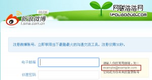 填寫表單項要有所填內容的示例,圖為新浪微博注冊信息,其中郵箱填寫格式就有提示文字和示例。