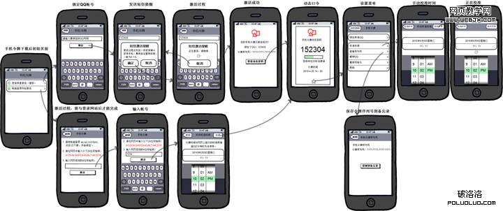 令牌在初期規劃時,設計師利用了草圖設計軟件mockups,設計了低保真交互原型初稿,快速搭建使用流程並與產品討論修改,流程界面如下圖: