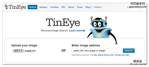 相比Retrievr並不實用的搜索功能,Tineye則靠譜的多。它是Idée公司(就是設計那款很NB的PixID的母公司)開發的圖像搜索網站。它所提供的搜索方式和Retrievr一樣,上傳本地圖片或是提供在線圖片的URL。TinEye 還為 IE、Chrome、Firefox 等浏覽器提供了插件和收藏夾腳本按鈕,用戶可以在浏覽器中使用右鍵菜單搜索相似圖片。