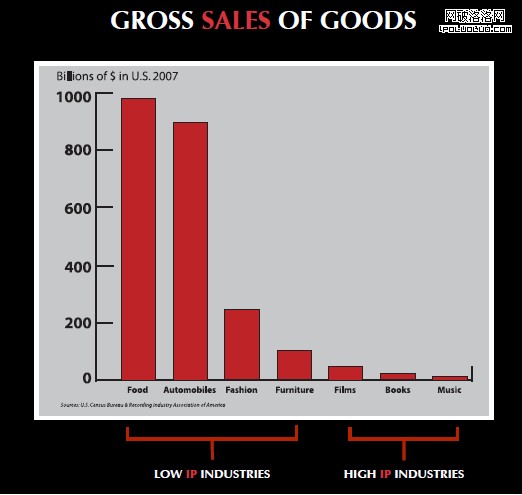 更讓人意外的是,演講者Johanna Blakley展示出一個圖表顯示,intellectual copyright protection越嚴格的行業,銷售額越低,而越沒有intellectual copyright protection的行業,銷售額越高: