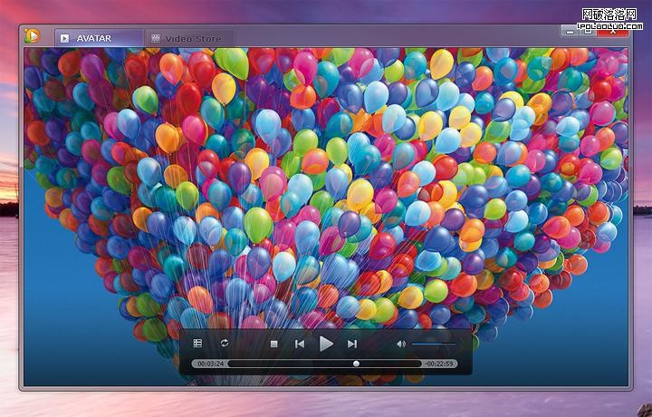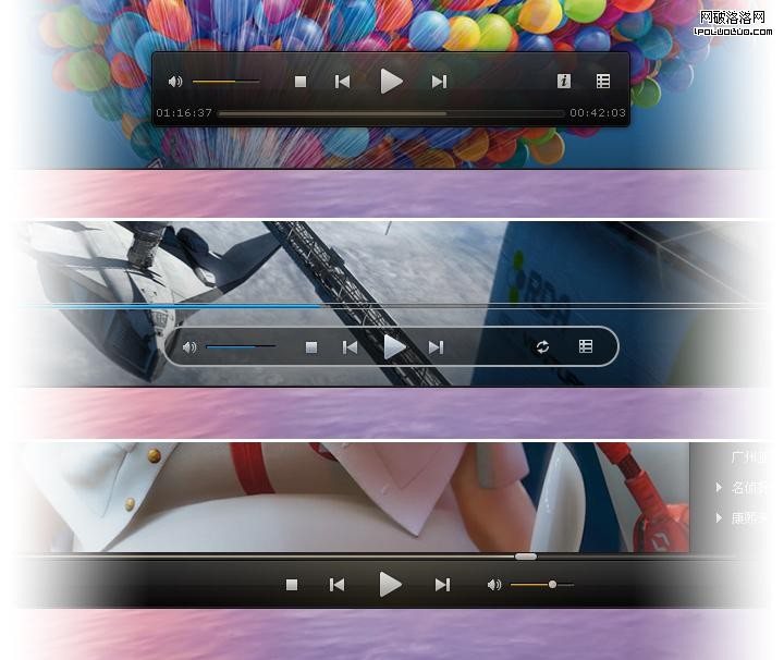 第一種是形式獨立於窗體的浮層式控制條,帶有半透明效果,在鼠標停留在畫面上一段時間的情況下才出現,鼠標離開響應區域後則自動消失。這樣的處理方式使的播放控制區域面積小,比較輕盈和有靈動;不過這種浮層式的最好有一定的透明度,但這在XP系統下比較難以實現;