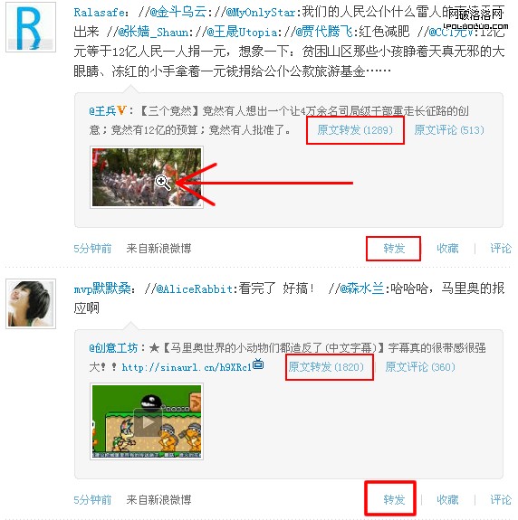 第二,轉發按鈕是如此的重要,如此誘人去單擊。大家看圖,新浪微博中的交互,第一個是轉發,第二個才是評論。而人人,第一是評論,第二是分享(即“轉發”),而且評論的UI更顯眼。
