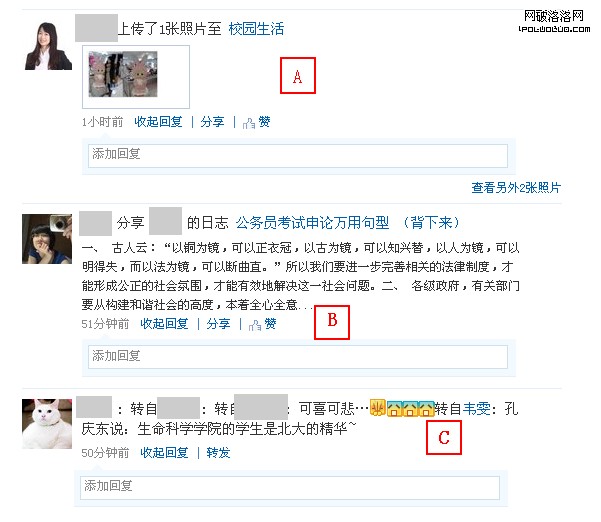 第二,對於好友的關注、分享內容等,只能進入新窗口中查看並且推薦,諸如A、C;這就等於多出了一個層級(下面與sina微博相比較,sina微博沒有任何層級)。