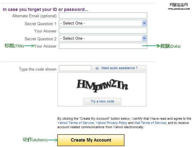 以上為Yahoo的注冊表單,我們可以大體觀察出三個主體元素:標題、數據、動作。它們是組成表單的基本元素,過多的修飾表單或過多無用信息會給用戶帶來更多的思考與厭惡。有時用戶會覺得表單很討厭,想做的是投票、申請工作、在網上買書、加入小組或從近期購物中拿到折扣等,但表單卻給用戶帶來了麻煩,妨礙了他們。