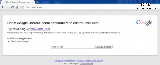 上圖就是一個典型的網站打不開時 Chrome 的提示頁面,我們除了看到“Oops! Google Chrome could not connect to chatroulette.com(哎呀,谷歌浏覽器無法連接到 Chatroulette.com)”之外,下面還有一行“Other users are also experiencing difficulties connecting to this site, so you may have to wait a few minutes.”翻譯過來就是: