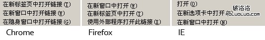 4、當在頁面的鏈接處用鼠標右鍵點擊時,彈出的菜單:IE從上下到是“打開”、“在新選項卡中打開”、“在新窗口中打開”;Firefox從上到下的順序是“在新窗口中打開”、“在新選項卡中打開”;而Chrome的則是“在新標簽頁中打開鏈接”、“在新窗口中打開鏈接”。IE的第一項“打開”完成就是左鍵單擊的行為,實則無意義;Firefox對這個順序的處理似乎仍停留在浏覽器還未引進標簽頁的設計上,標簽頁正是為了解決桌面上鋪滿浏覽器窗口而設計的,所以在這個順序上,Chrome的設計則是最好的;
