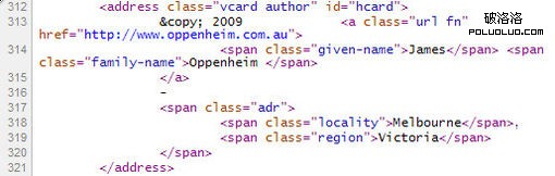 微格式(Microformat)是在標准 XHTML 代碼中嵌入結構化數據的一種新方法,簡單的說,就是通過一套已定的Class命名標准,來申明文檔中的內容。大多數人了解的微格式都是從hCard開始, 以下是一段是簡單的hCard實例(http://www.oppenheim.com.au/),這是James Oppenheim應用到頁腳的hCard。