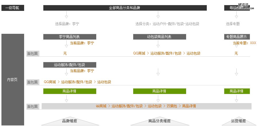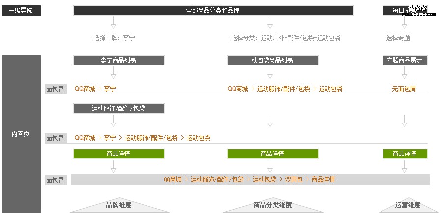 上圖中我們可以發現,商品的信息結構是唯一的:即:【QQ商城 > 運動服飾/配件/包袋 > 運動包袋 > 雙肩包 > 商品詳情】,分析三個浏覽維度的面包屑表意: