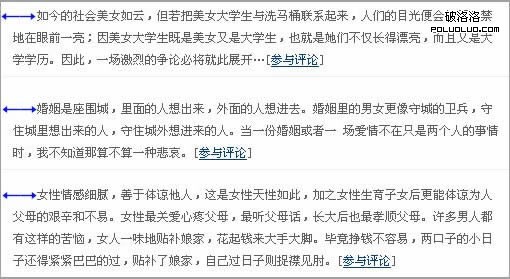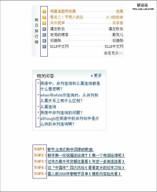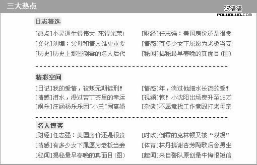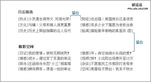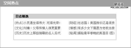 從屬關系:從屬關系表示A信息全部包含在B信息之內,或者表示A信息依附於B信息。就好比如標題和正文的關系,所以A信息是B信息的一個子集。如下圖中,“空間熱點”就包含“日志精選”,她們之間就是從屬關系。而“日志精選”裡又包含6條文章名稱,它們之間也是一種從屬關系,這就是我們所說的正文和標題的關系。