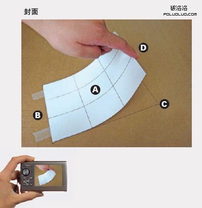(一)做一個模板:要達到以假亂真的效果,就必須來源於真實的生活。A:選擇一個與你封面尺寸一樣大小的白紙,然後畫個九宮圖!當然,每個格不一定剛好是正方形(可以在電腦中畫好線再打印出來比較精確)。B:將白卡紙放在台面上,另一端用透明膠粘在桌面上;C:在桌面上也要畫上紙張的輪廓線;D:然後掀起紙的一邊,抬起的角度根據你自己喜好所定。最後再拍張照片。