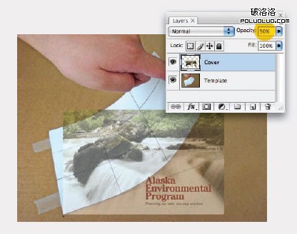 (二)打開PS,雙擊背景層解鎖,命名為Template(模板),點“確定”。然後將封面圖片放進來,減低封面圖片的不透明度(50%),以便能看到下方的模板圖片中的格線。