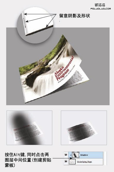 (六)增加封面與下方頁面的陰影:在下方頁面圖層上方增加一個新層,將前景色設為黑色,選擇一枝直徑比較大邊緣比較柔軟的畫筆,按上圖所示呈角度畫上陰影。然後在陰影圖層及下方面頁圖層中間,按住ALT鍵點擊,應用剪貼蒙板,這樣陰影就只在下方頁面上產生。
