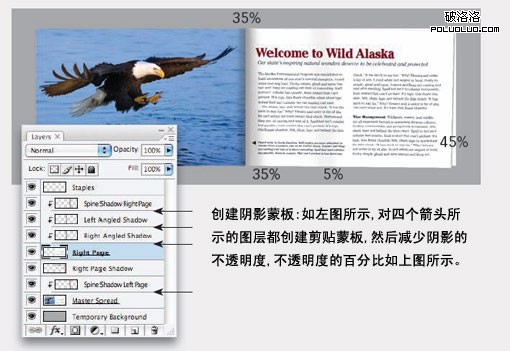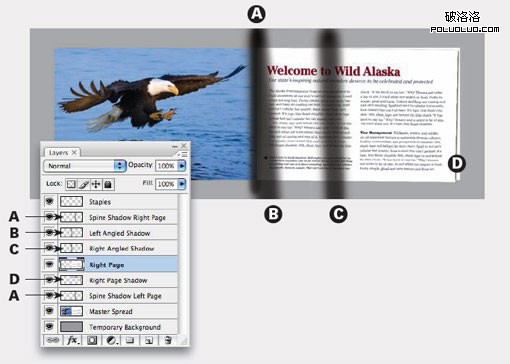 (三)增加陰影:新建多個單獨圖層,分別在上圖所示的A、B、C及D處增加陰影。留意圖層面板所示,陰影A圖層被復制成兩個圖層,分別放置於右邊頁面圖層的上方及下方。